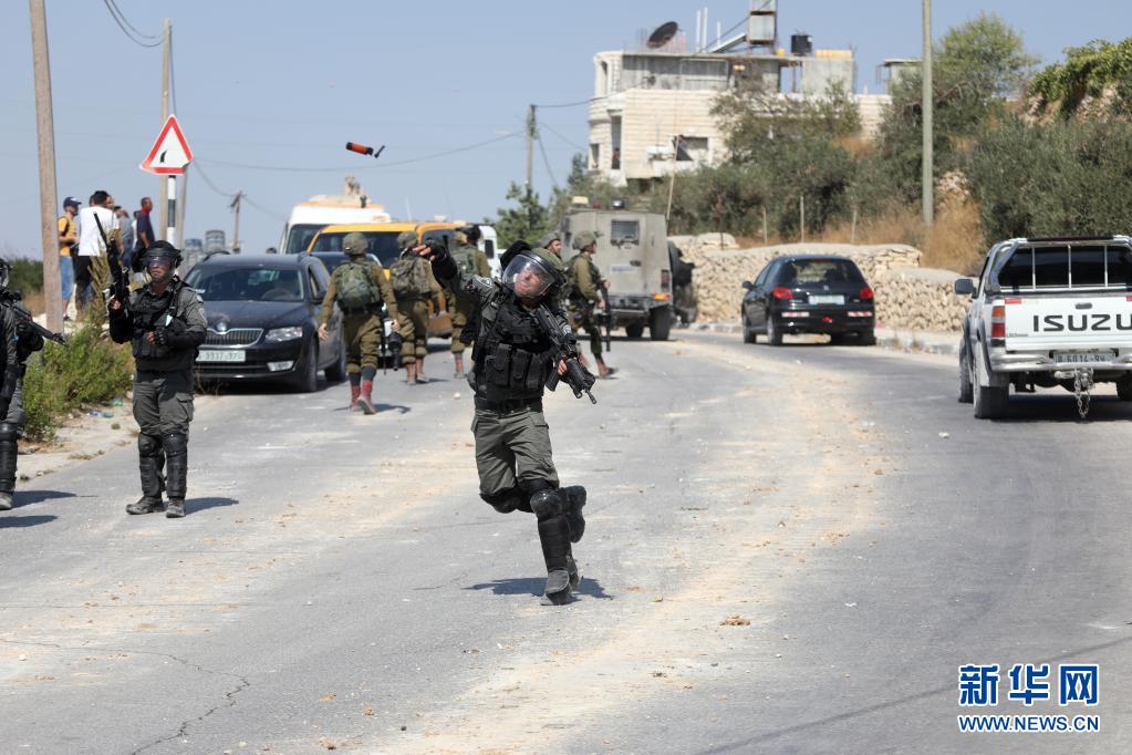 8月5日,一名以色列边防警察在约旦河西岸城市希伯伦投掷催泪瓦斯。