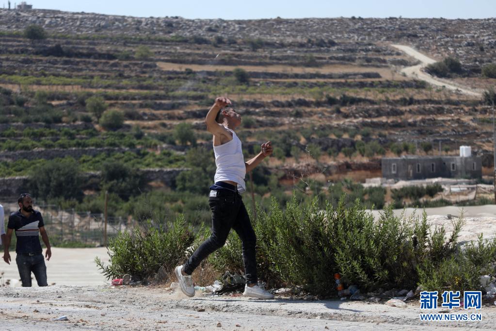 8月5日,一名抗议者在约旦河西岸城市希伯伦投掷石块。