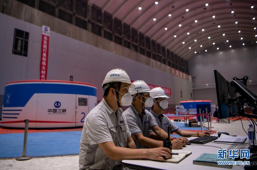技术人员在白鹤滩水电站调试发电机组(7月1日摄)。