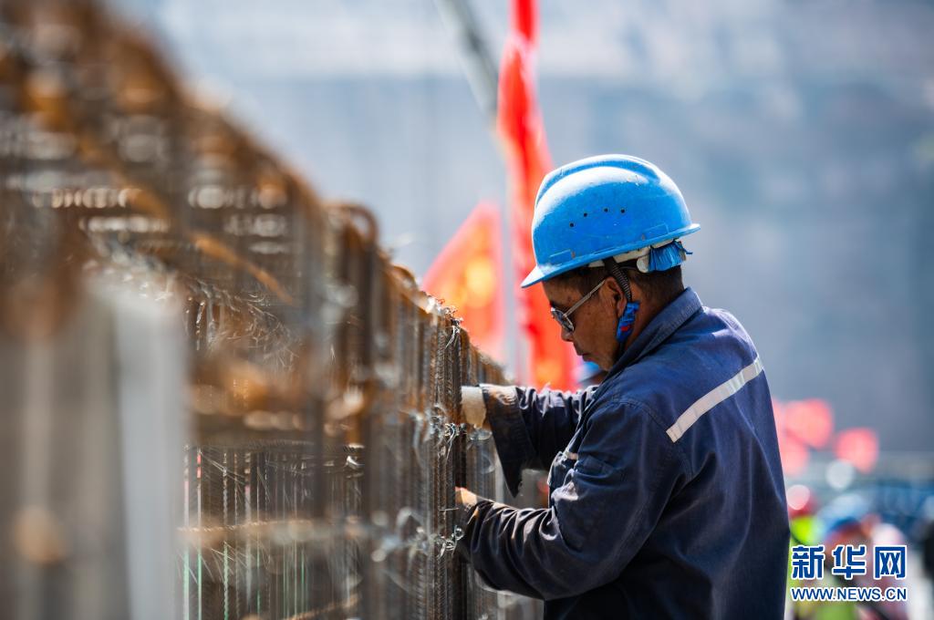 工人对白鹤滩水电站大坝进行养护(5月31日摄)。