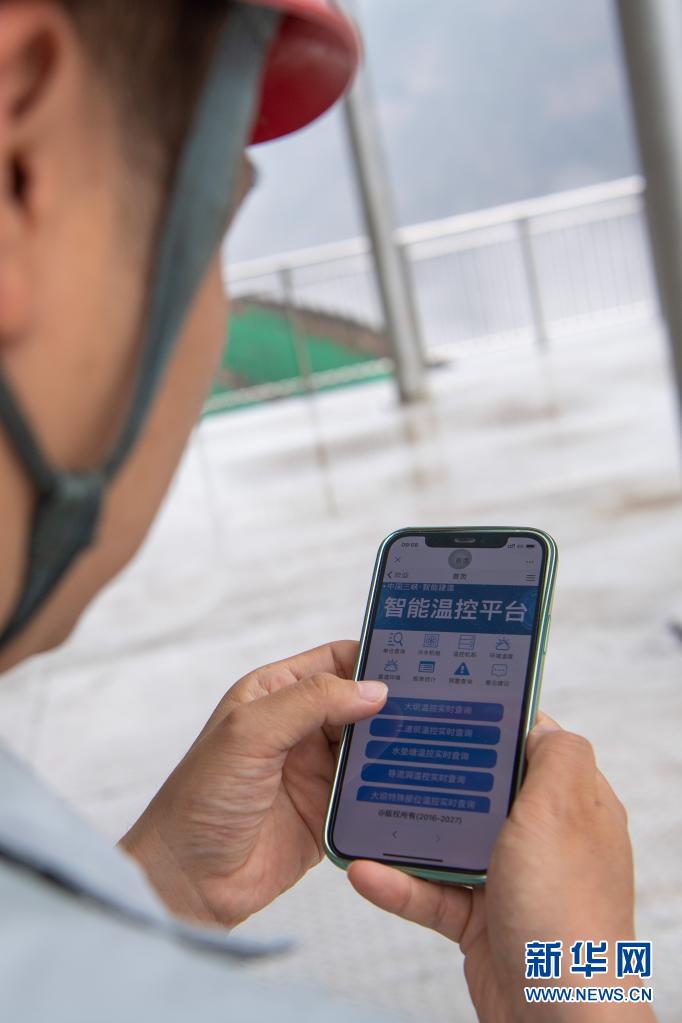 在白鹤滩水电站,工作人员在手机上通过智能温控平台监测大坝温度(6月9日摄)。