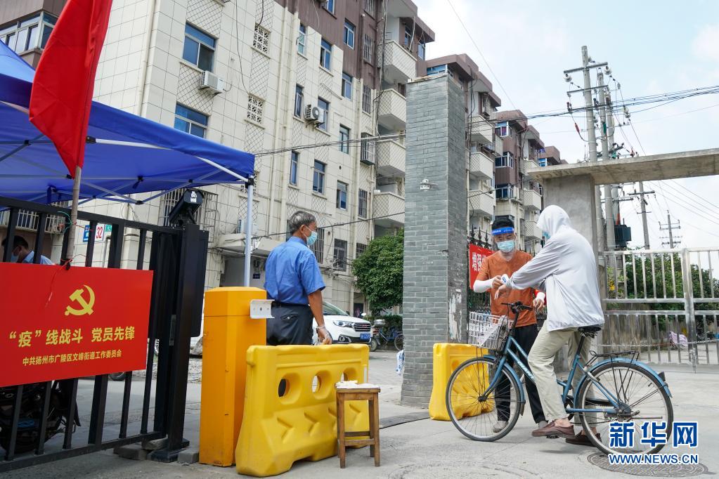8月6日,在扬州市广陵区文峰街道三里桥社区,社区人员在为进入小区的居民量体温、检查苏康码等信息。新华社记者 李博 摄