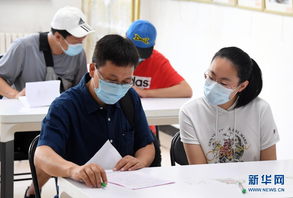 8月6日,在北京市海淀区学院路街道新冠疫苗接种点,未成年人(前右)及家长准备填写知情同意书。新华社记者 任超 摄