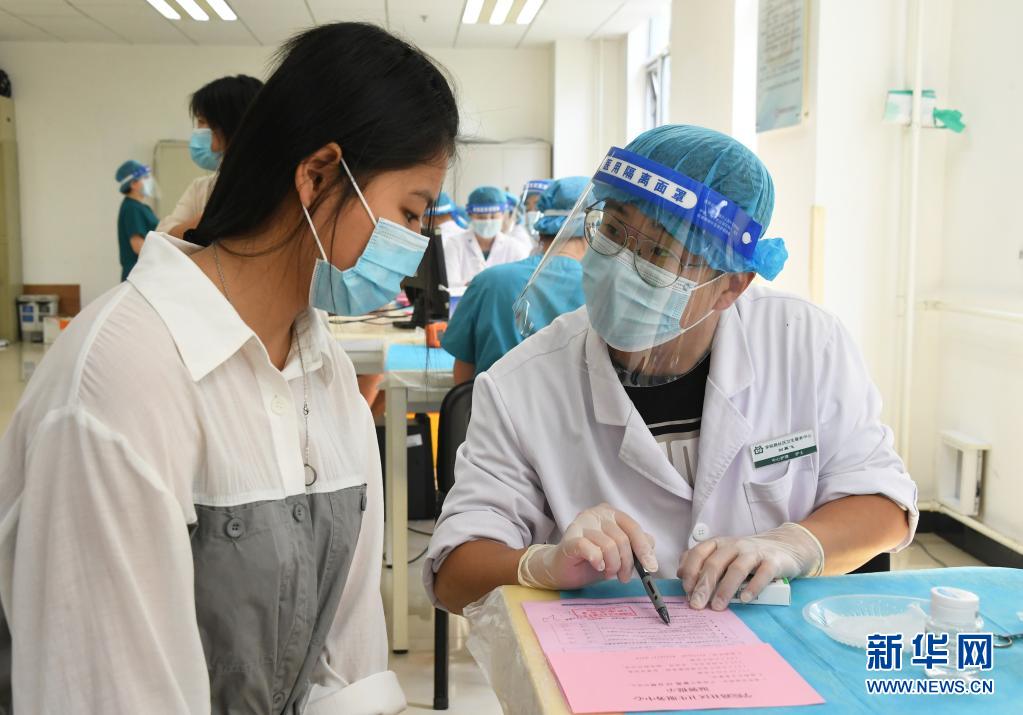 8月6日,在北京市海淀区学院路街道新冠疫苗接种点,医护人员在接种前询问一名未成年人身体状况。新华社记者 任超 摄