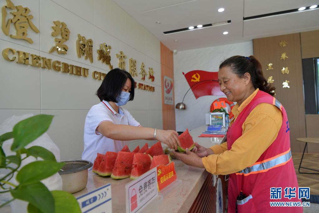 8月6日,在江西省南昌市南昌县一处“红色驿站”爱心服务点,工作人员为环卫工人提供免费的西瓜和绿豆汤。新华社记者 彭昭之 摄