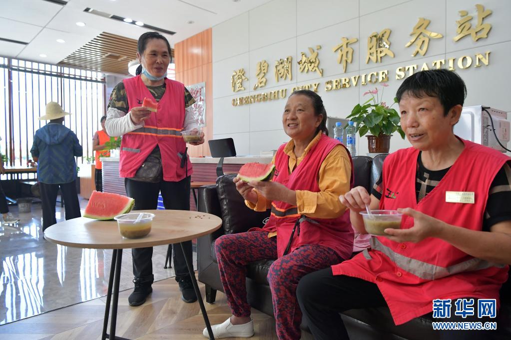 8月6日,在江西省南昌市南昌县一处“红色驿站”爱心服务点,环卫工人们在吃西瓜,喝绿豆汤。新华社记者 彭昭之 摄
