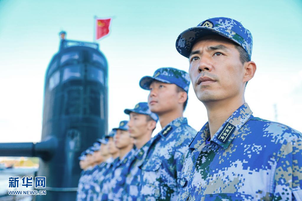 东部战区海军某潜艇支队教练艇长胡晓舟(右一)在潜艇上与官兵整齐列队(6月21日摄)。