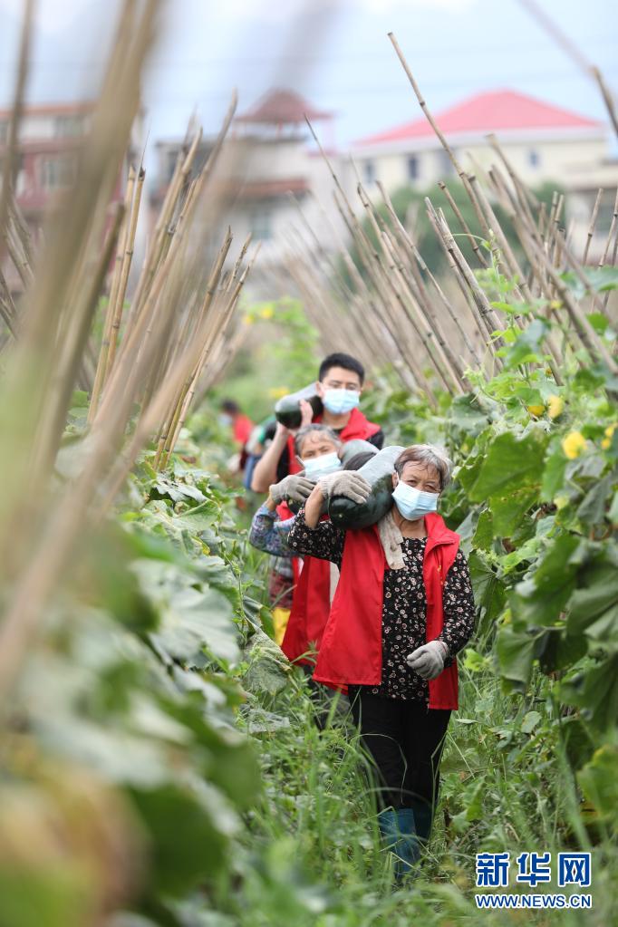 8月5日,志愿者在衡阳县关市镇与当地村民一起采摘准备捐赠的冬瓜。新华社发(刘欣荣 摄)