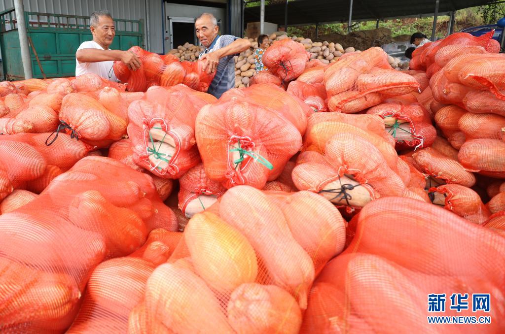 8月5日,衡阳县樟木乡永升村村民把准备捐赠的南瓜打包装袋。 新华社发(曹正平 摄)