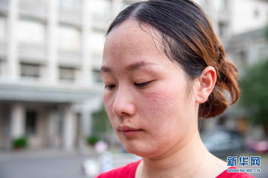 在武昌区水果湖街道茶港社区,武汉大学中南医院创伤与显微骨科护士张祥翰摘下口罩后脸上可见深深的勒痕(8月6日摄)。