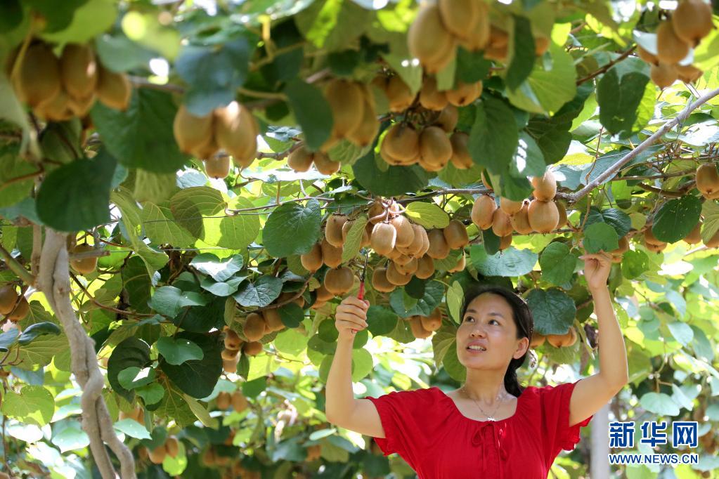 8月7日,山东省枣庄市市中区齐村镇前良村农民周慧在果园里管理种植的猕猴桃。