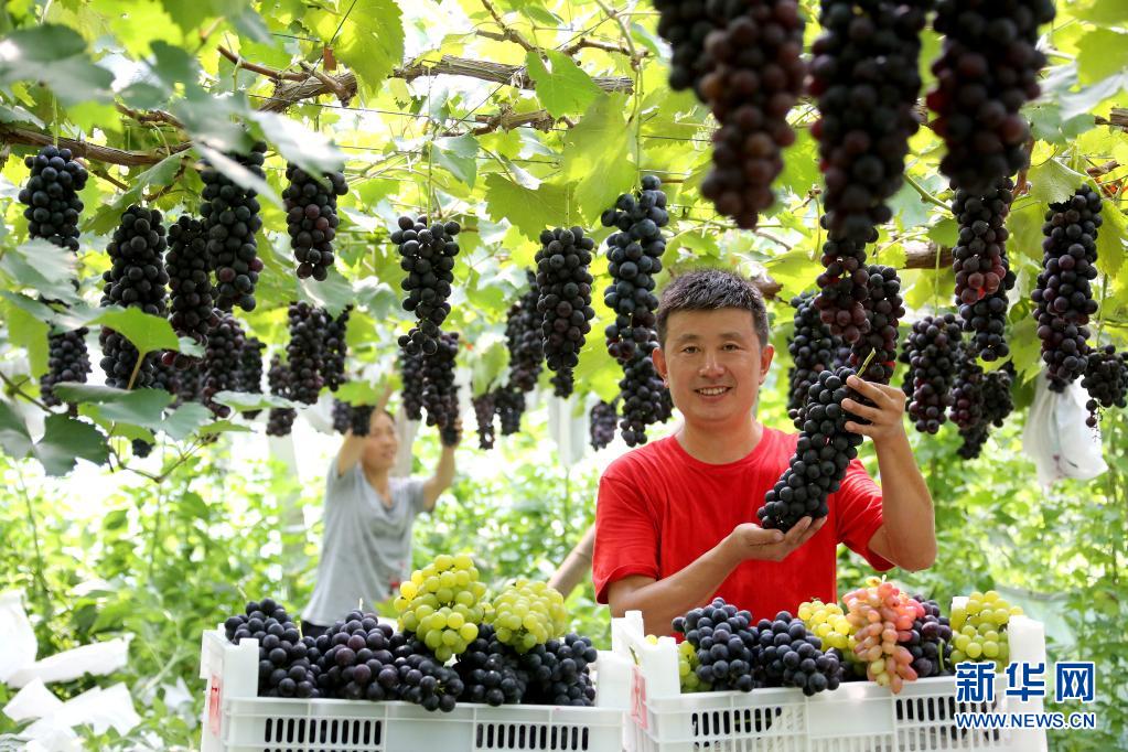 8月7日,山东省枣庄市市中区齐村镇渴口村农民高焕磊(右)在果园里展示刚刚采摘的葡萄。