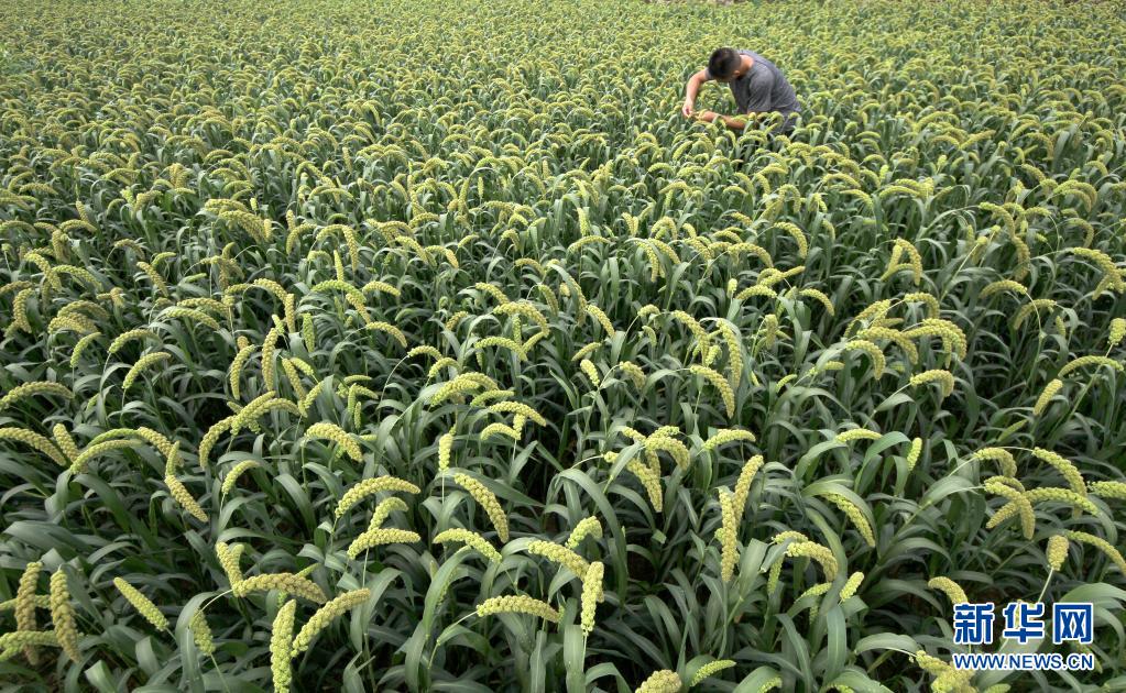8月7日,山东省枣庄市市中区齐村镇柏山村农民在田间查看谷子的长势。