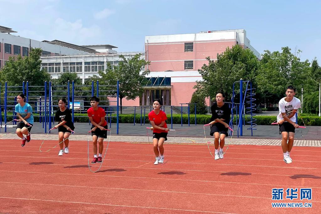 7月24日,在山东省淄博市周村区城北中学,天绳健跳绳队队员在操场上训练。