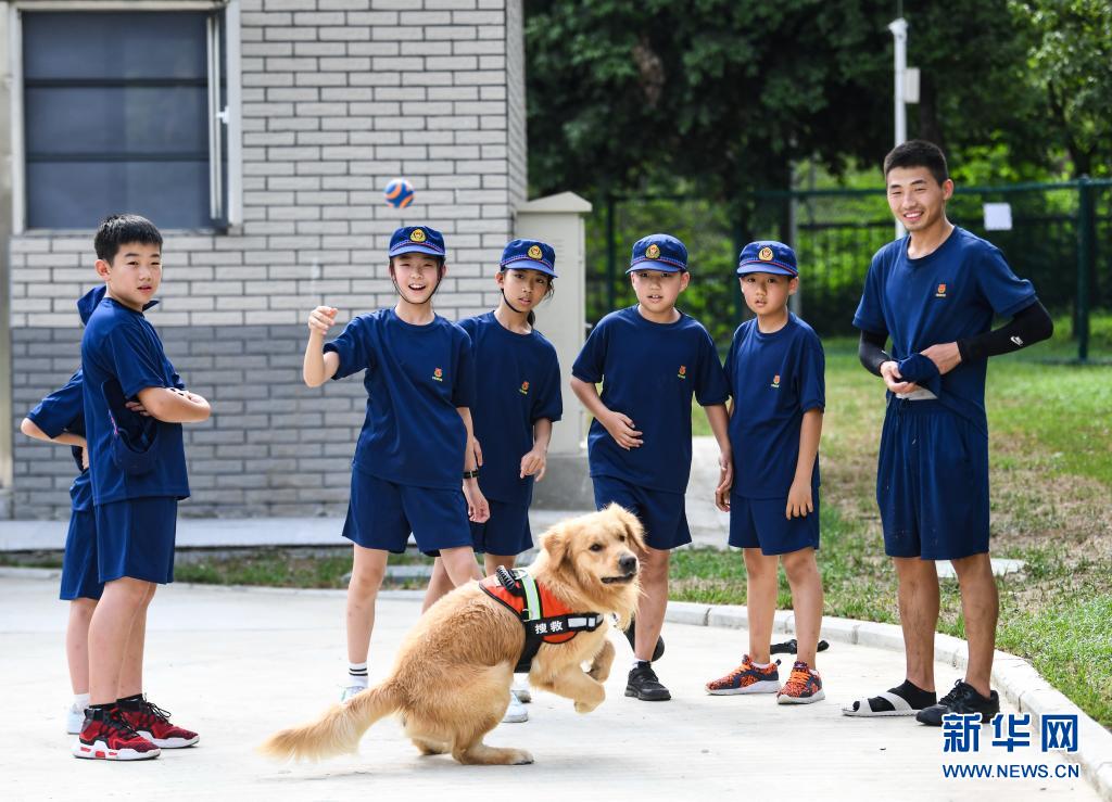 在四川省森林消防总队特勤大队,参加体验营的孩子们和搜救犬“麒麟”互动(7月27日摄)。
