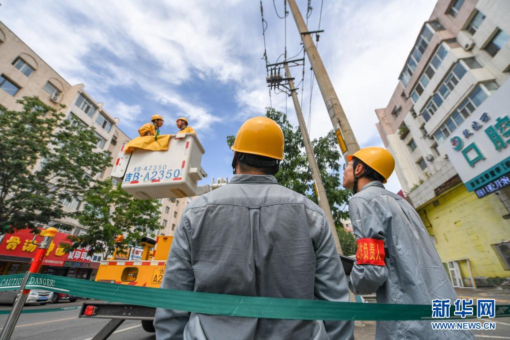 在吉林省吉林市青岛街与光华路交汇处,电力工人在室外作业(7月22日摄)。