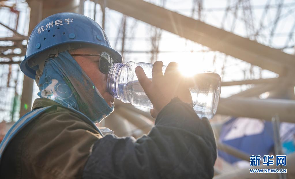 8月4日,中建八局施工人员在重庆龙兴足球场施工间隙喝水。近日重庆气温持续走高,最高气温超过40摄氏度。