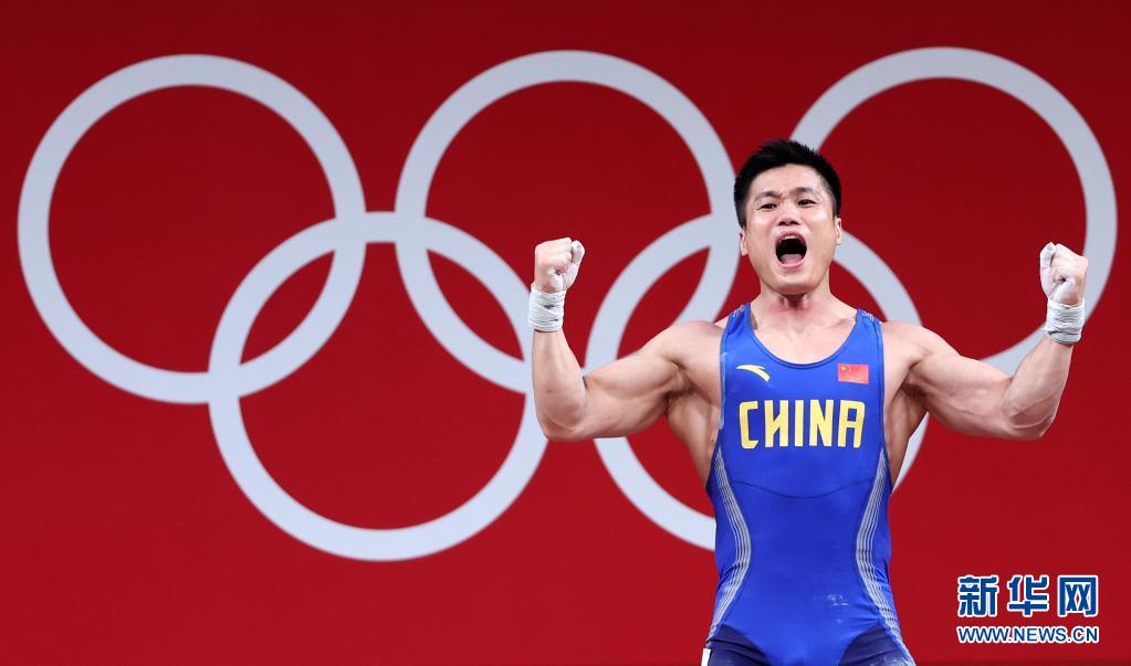 7月31日,吕小军在东京奥运会举重男子81公斤级决赛中夺冠后庆祝。新华社记者 杨磊 摄