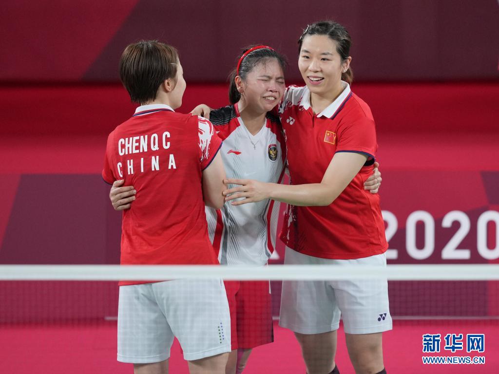 8月2日,中国选手陈清晨(左)与贾一凡(右)在羽毛球女子双打决赛后拥抱印尼选手波利。新华社记者 薛玉斌 摄