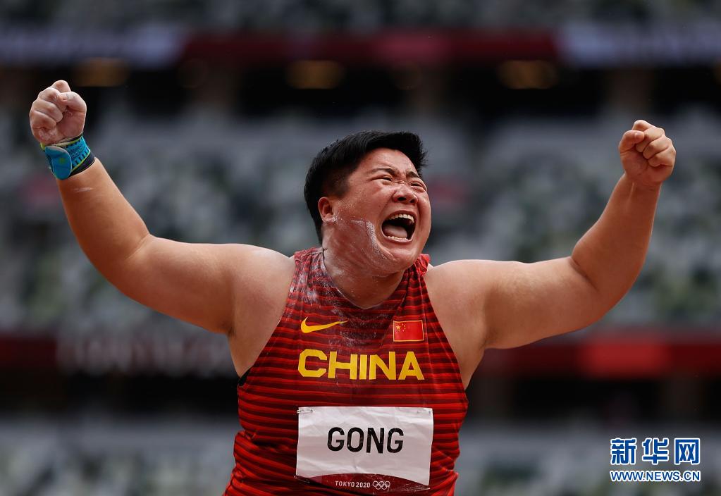 8月1日,中国选手巩立娇在东京奥运会女子铅球决赛中庆祝。新华社记者 王丽莉 摄