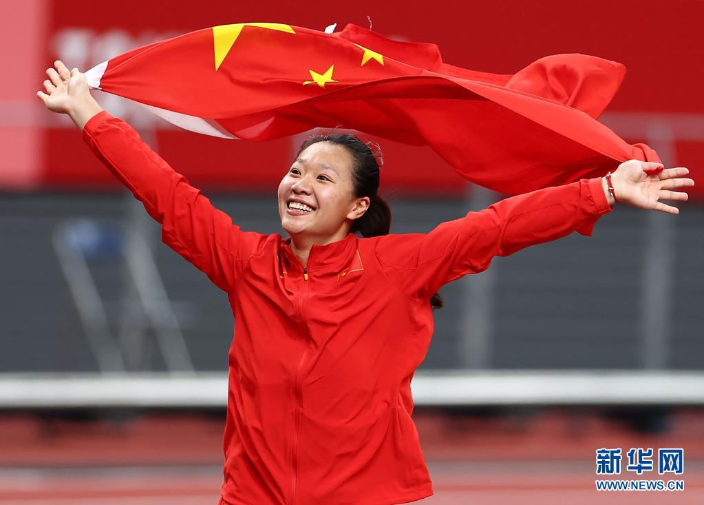 8月6日,刘诗颖在东京奥运会田径女子标枪决赛后庆祝胜利。新华社记者 兰红光 摄