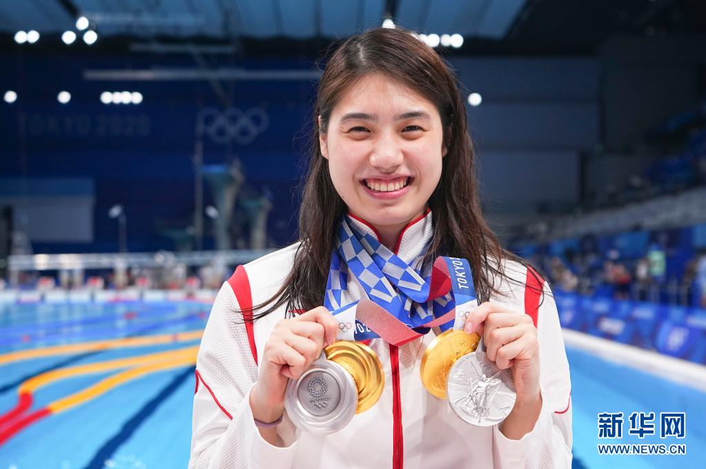 8月1日,张雨霏展示她在本届奥运会游泳项目比赛中收获的两枚金牌和两枚银牌。新华社记者 许畅 摄