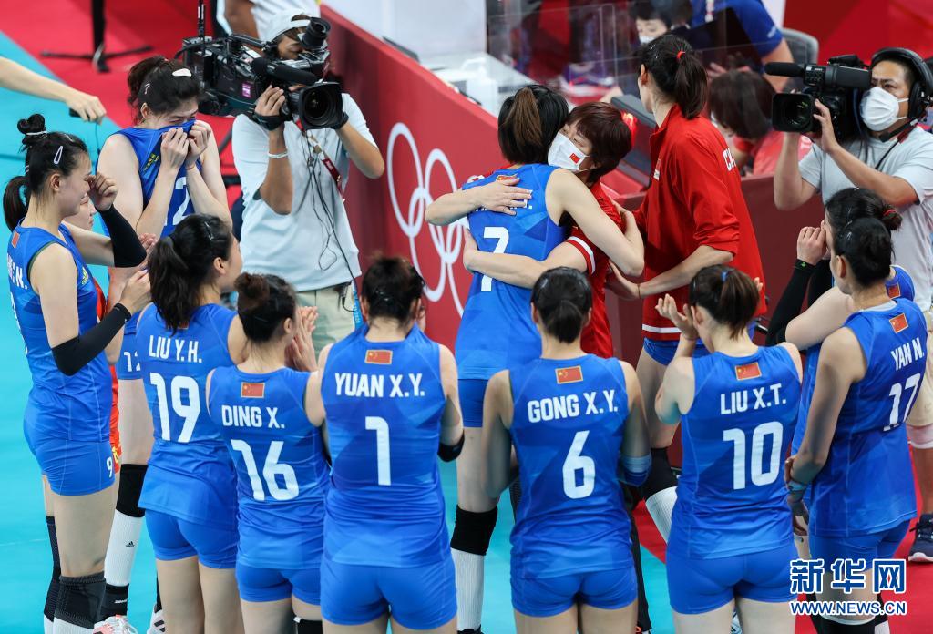8月2日,中国队主教练郎平在最后一场小组赛后与队员一一拥抱。新华社记者 丁汀 摄