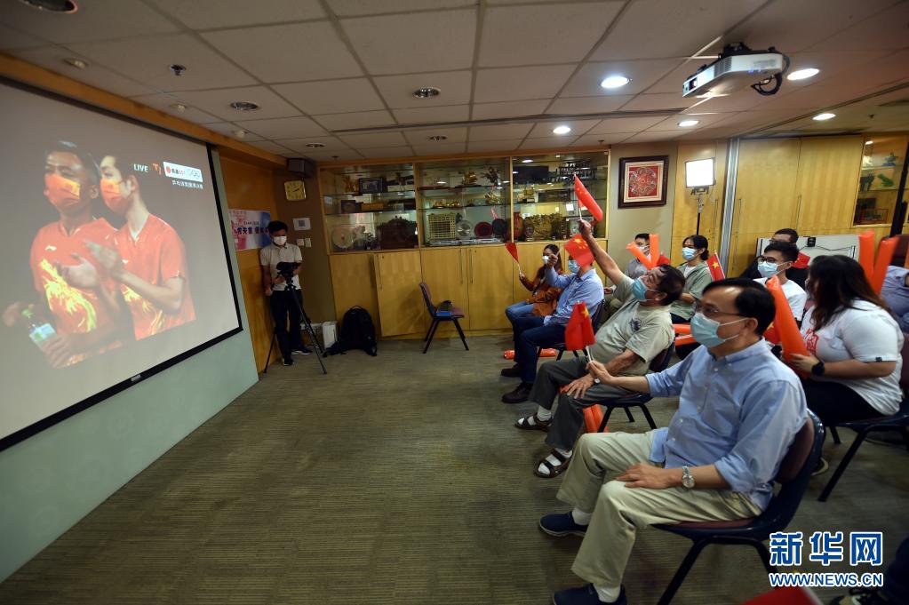 尹广霖(前排右二)在香港观看东京奥运会男子乒乓球半决赛直播(8月4日摄)。