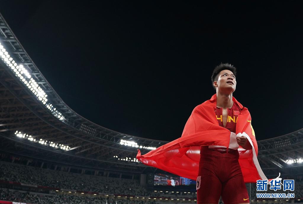8月1日,中国选手苏炳添在东京奥运会田径项目男子100米决赛后身披国旗。新华社记者 吕小炜 摄