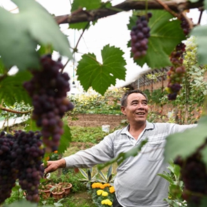 8月5日,魏金明在玉树市结古镇新寨村的蔬菜基地整理葡萄架。