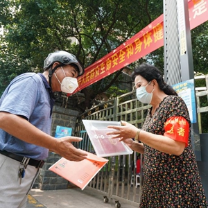 8月10日,在南京市建邺区南苑街道吉庆家园小区门前,马维珍将一户居民的小孩上学报名材料送出。新华社记者 季春鹏 摄