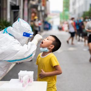 8月10日,在张家界市永定区官黎坪街道,医务人员给居民做核酸检测取样。