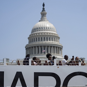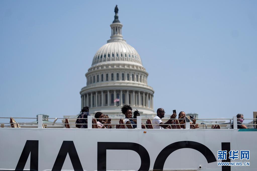 8月10日,在美国华盛顿,一辆旅游大巴从国会大厦前驶过。