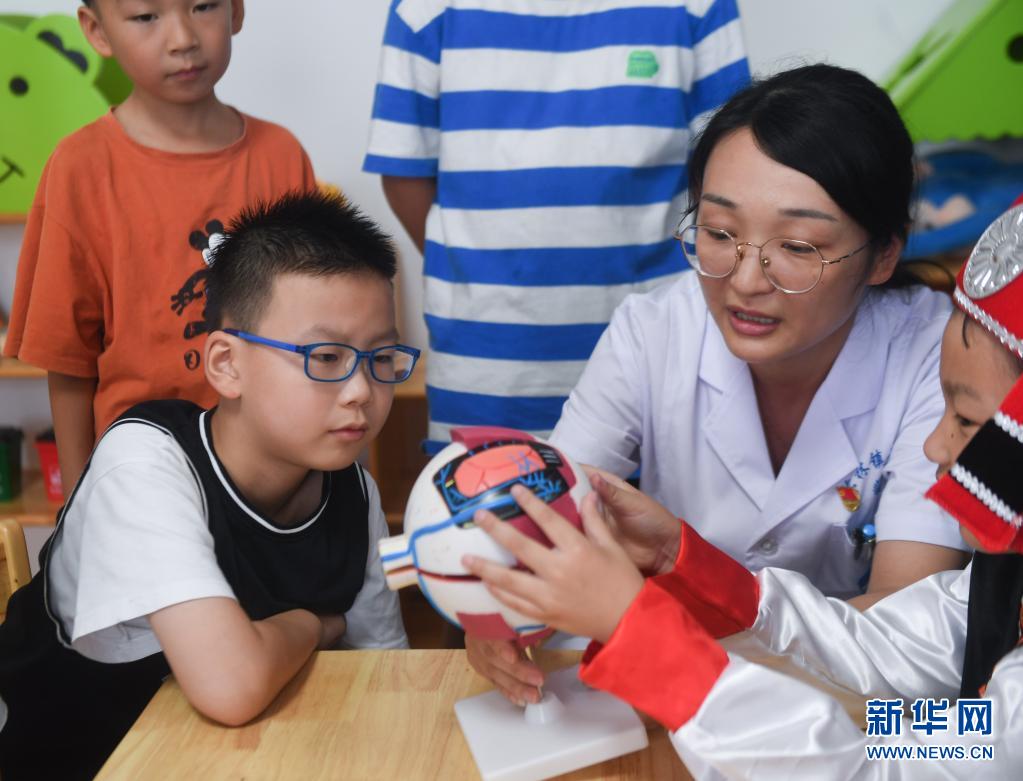 8月11日,东林卫生院的党员志愿者医生给孩子们讲解眼睛的构造和视力保护知识。