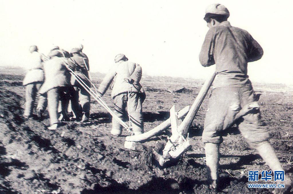 创业初期,新疆生产建设兵团在戈壁上开荒的情景(资料照片)。