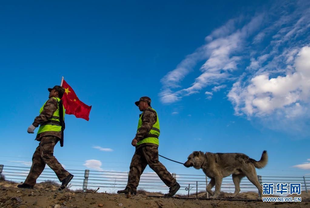 新疆生产建设兵团十师185团职工马军武(右)在巡逻途中(4月9日摄)。