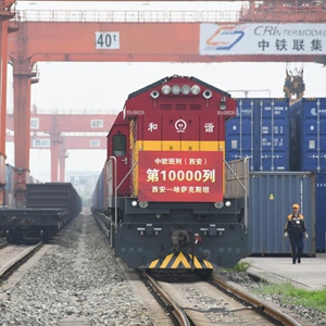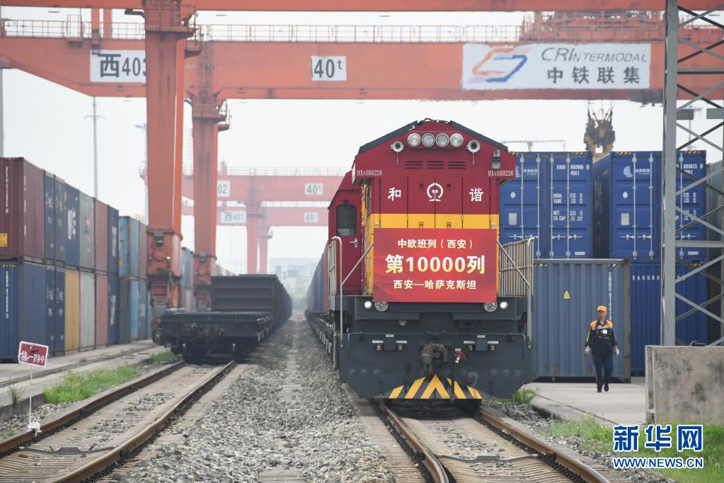 8月11日,装载着布料、载客电梯、暖气片等50车货物的X9041次中欧班列(西安),从西安国际港站开出,开往哈萨克斯坦,这是陕西累计开行的第10000列中欧班列。
