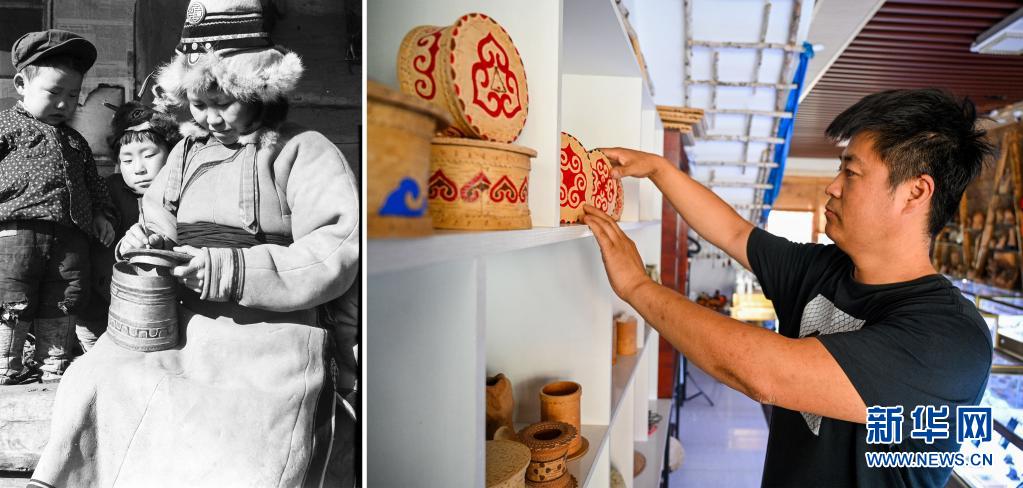 拼版照片:左图为1961年,鄂伦春族妇女手握画笔在桦皮盒上绘画(资料照片);右图为2021年8月7日,在鄂伦春自治旗阿里河镇,经营民族工艺品店的姜力先在摆放桦皮盒(新华社记者连振摄)。