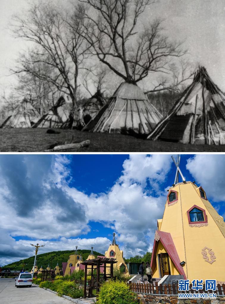 拼版照片:上图为鄂伦春族游猎时期的住房(资料照片,鄂伦春自治旗供图);下图为2021年8月6日拍摄的鄂伦春自治旗大杨树镇多布库尔猎民村的猎民部落景区(新华社记者连振摄)。