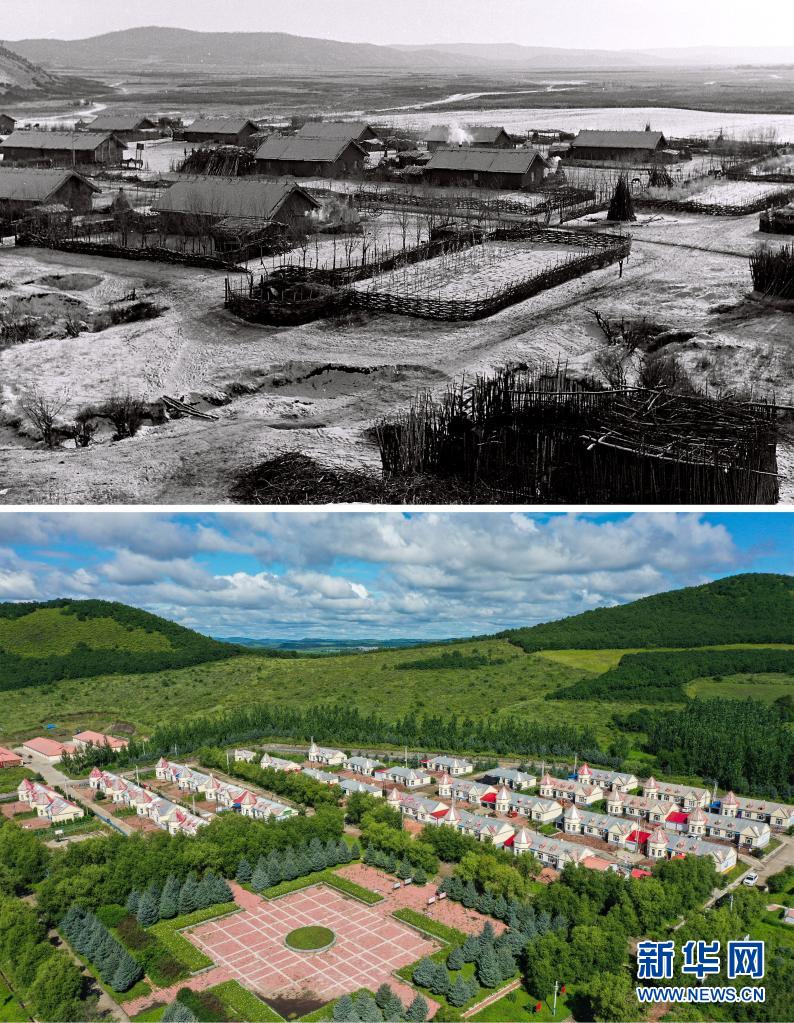 拼版照片:上图为第一代多布库尔猎民村(资料照片);下图为2021年8月6日拍摄的鄂伦春自治旗大杨树镇多布库尔猎民村(无人机照片,新华社记者刘磊摄)。
