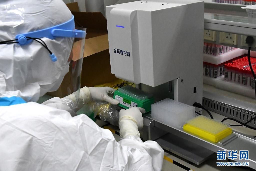 疫情发生后,该机构组建了600多人的检测队伍,投入300余台仪器设备,实现24小时人机不间断检测。通过流程优化、技术整合和信息化升级,中心每日可检测20多万管,按10:1的混检比例,可筛检200多万人份。新华社记者 李安 摄