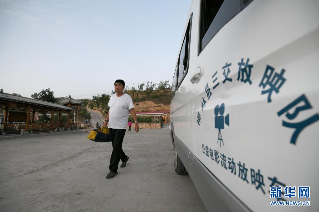 在柳林县三交镇高家焉村,刘步飞拿着幕布从流动放映车边走过(8月10日摄)。