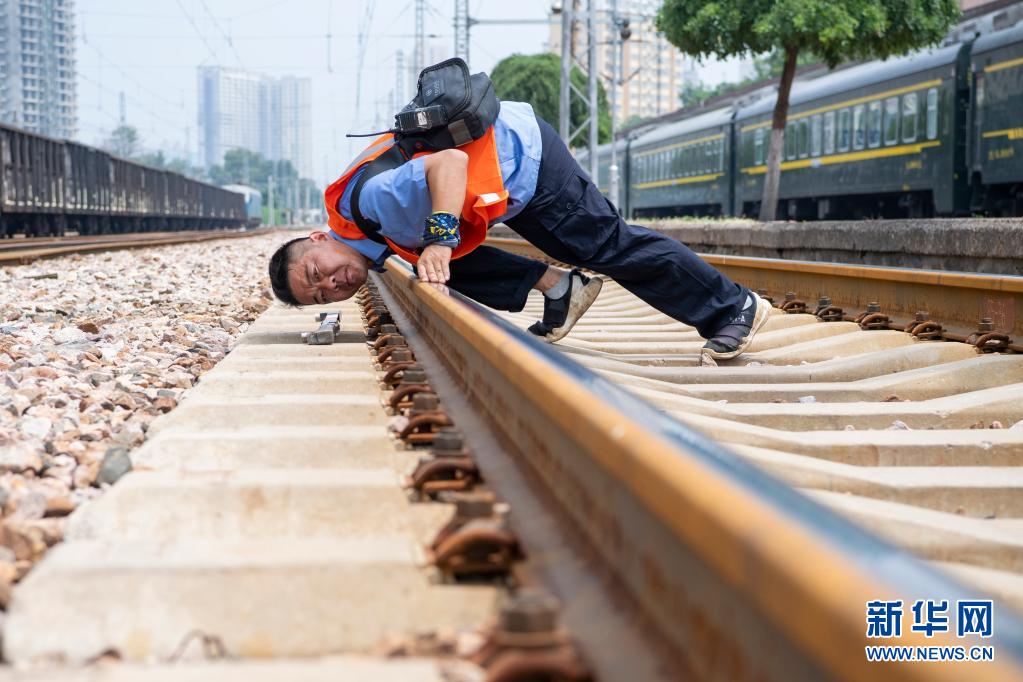 8月11日,在南同蒲线运城站,李宁俯身目测线路水平变化。