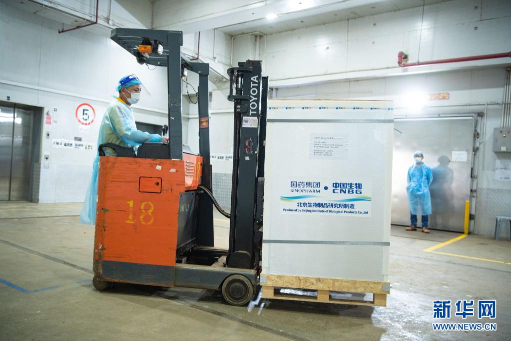 8月12日,工作人员搬运第三批国药新冠灭活疫苗。