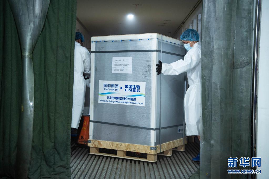 8月12日,工作人员搬运第三批国药新冠灭活疫苗。