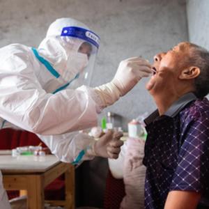 8月12日,在张家界市永定区沅古坪镇柏杨坪村,医务人员上门给村民做核酸检测取样。