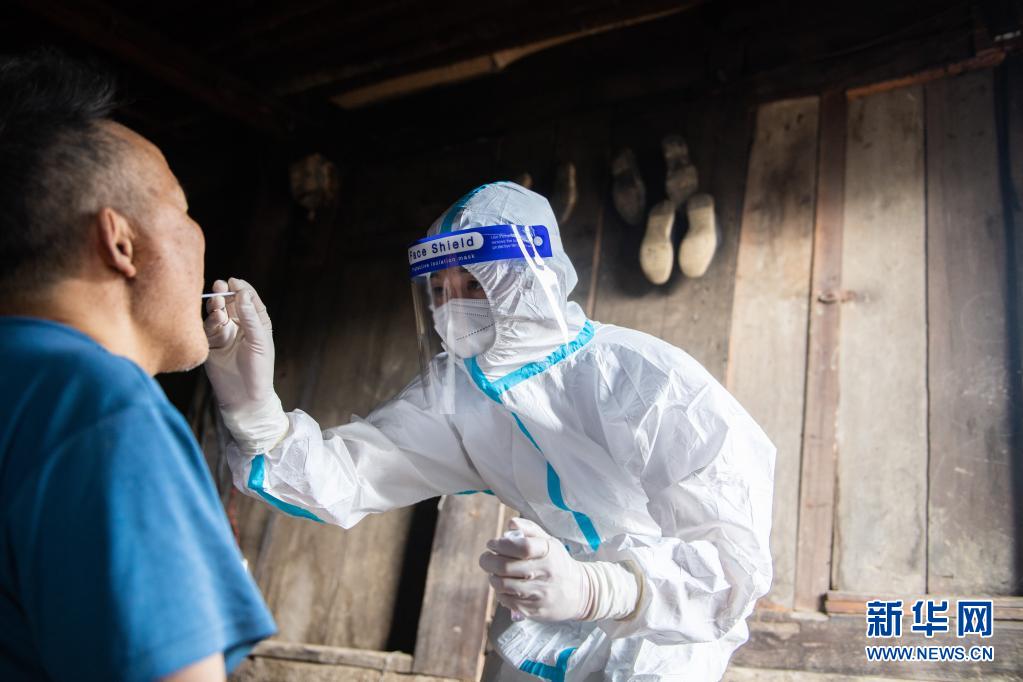 8月12日,在张家界市永定区沅古坪镇柏杨坪村,医务人员上门给村民做核酸检测取样。