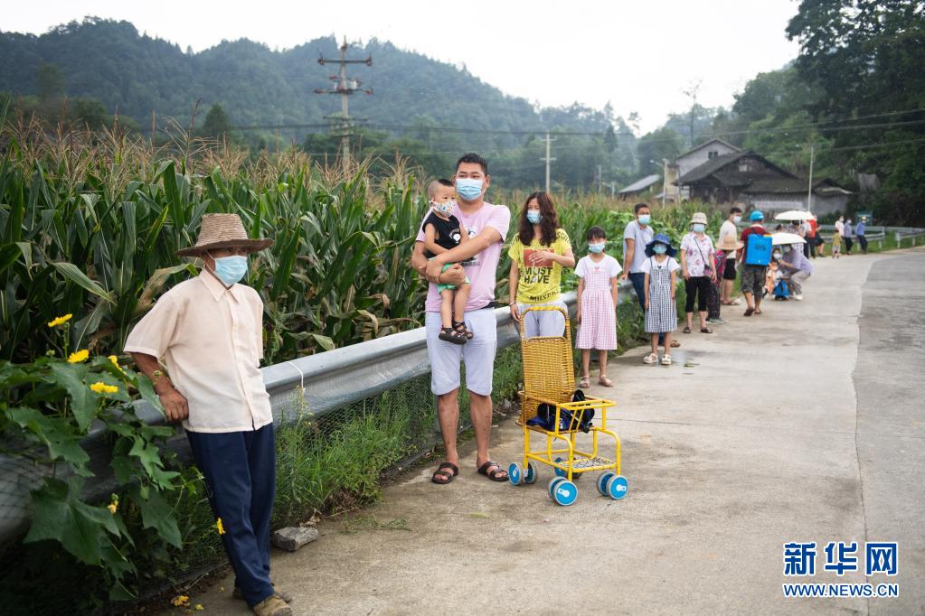8月12日,在张家界市永定区沅古坪镇柏杨坪村,村民排队等待做核酸检测。