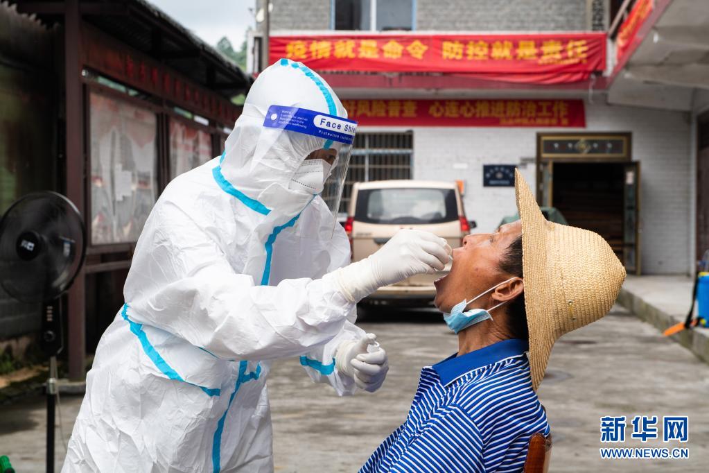 8月12日,在张家界市永定区沅古坪镇柏杨坪村,医务人员给村民做核酸检测取样。
