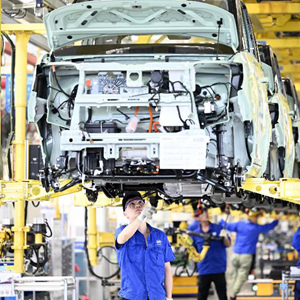 8月12日,在广西柳州一家汽车企业,工人在新能源汽车生产线上忙碌。